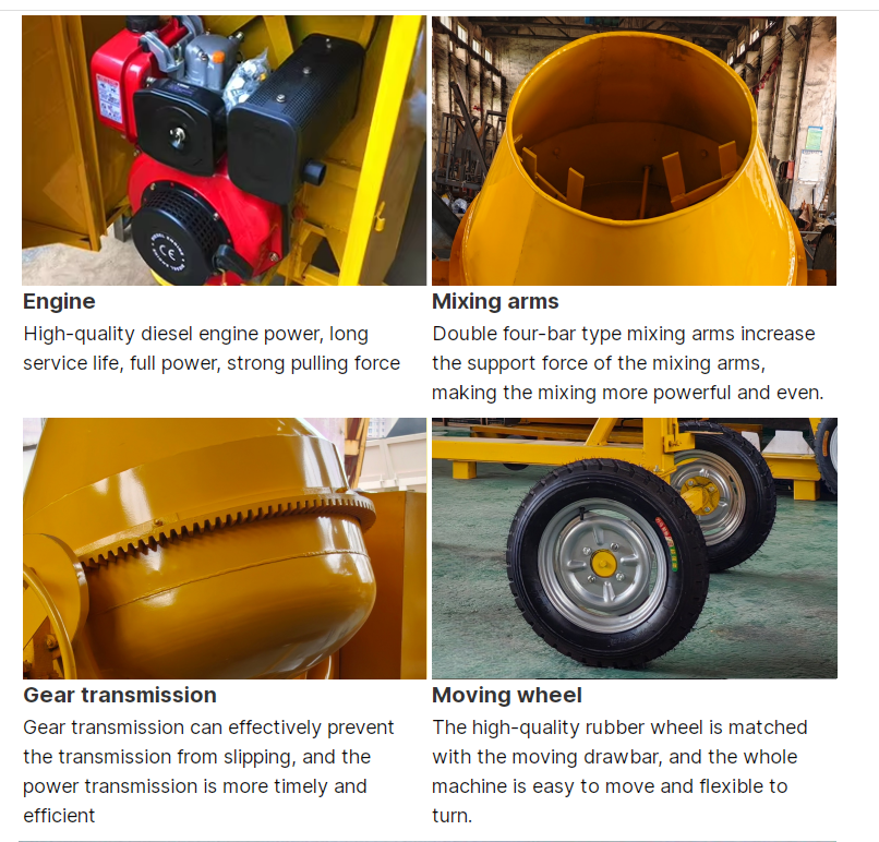 The cement mixer,It can be used for mixing plastic and semi-dry concrete.The mixing drum is stirring,turning out the material.It is suitable for construction site,road,bridge engineering and small and medium concrete composition factory without electricity.
